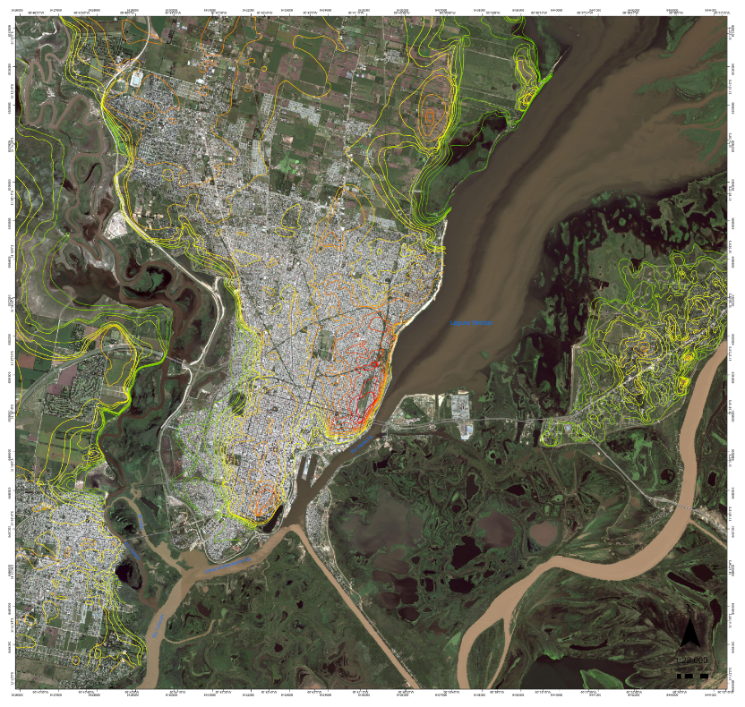Imagenes y Cartografía relevante para la localidad de Santa Fe, mostrando zonas de riesgo y sistemas de defensa.